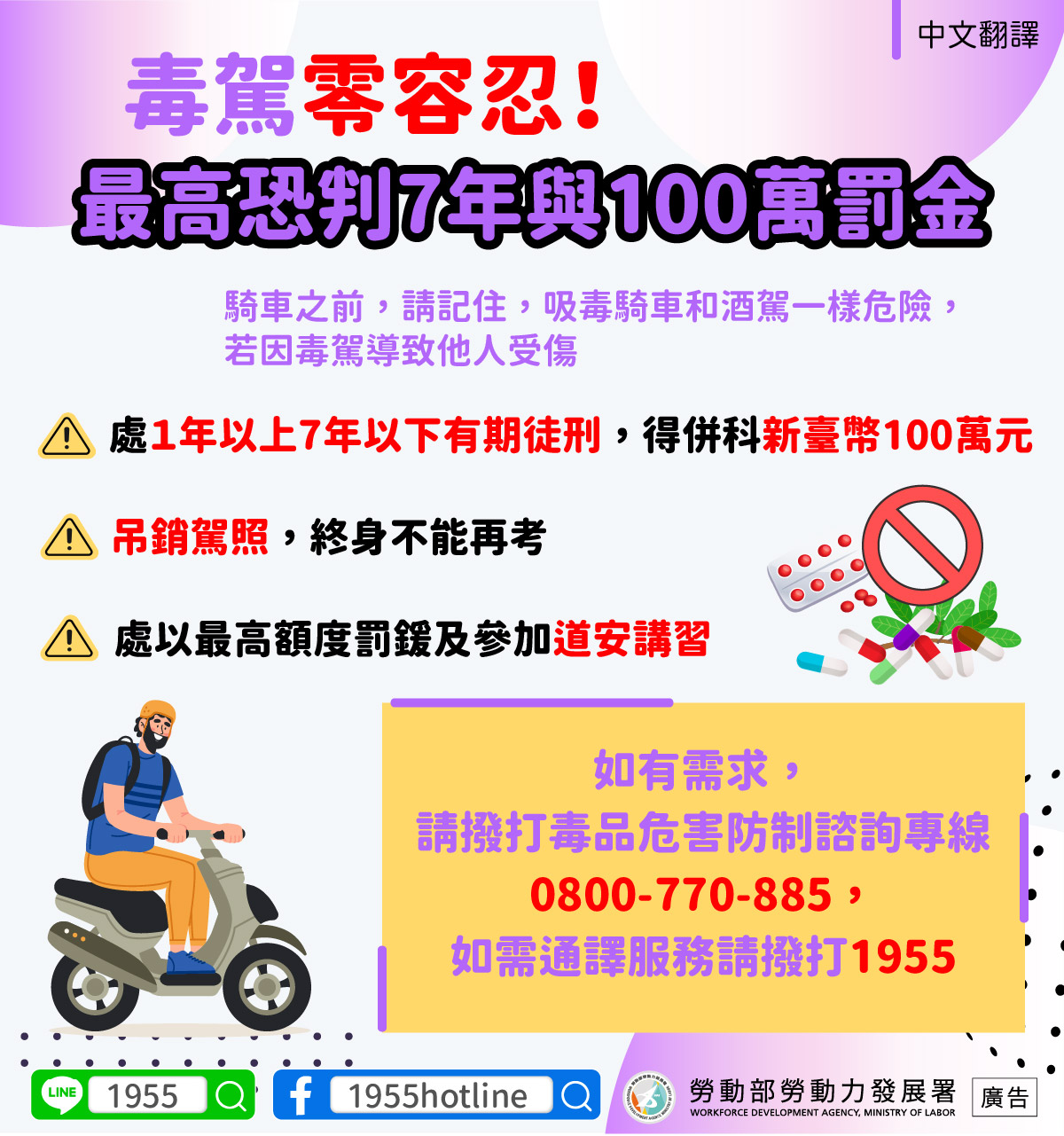 ▍Zero tolerance for diriving under the influence of narcotics Maxmimum sentence of 7 years in jail and a NT$1 million fine