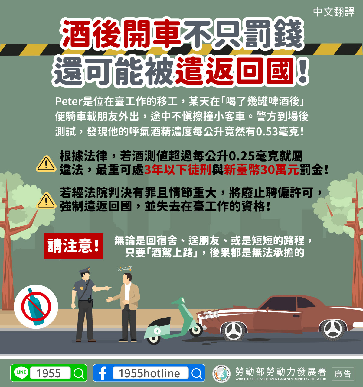 •Theo quy định, nếu nồng độ cồn trong hơi thở vượt quá 0.25 miligam/lít là vi phạm pháp luật, và mức phạt cao nhất có thể là 3 năm tù giam và 300.000 Đài tệ tiền phạt!